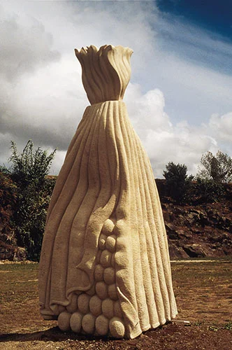 The carved and softly wrapped stone sculpture draws parallels to another layer of oppression, combining reference to oppression of the early Celts, by Christianity. The clergy created a 'fiery' Saint Brigid in the attempt to eclipse an earlier Celtic belief; worship of the three-fold, wonder-working goddess, Brigid.
