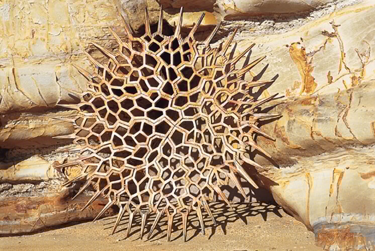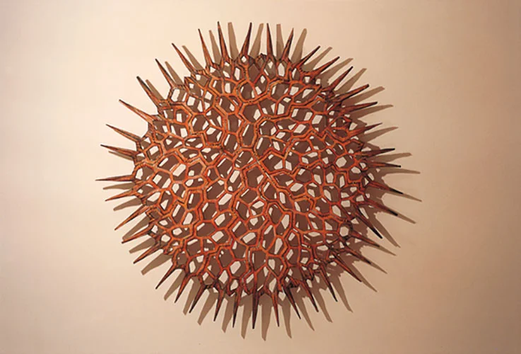 I made a cardboard pattern before beginning the work. I then cut the wood sections with a jigsaw and used a chain-saw for surface texture finishing. The pieces were drilled and lightly burnt with a blow torch prior to joining. Using the traditional method for repairing antique ceramic vases, I drilled small holes in the wood and connected the sections together with copper wire.