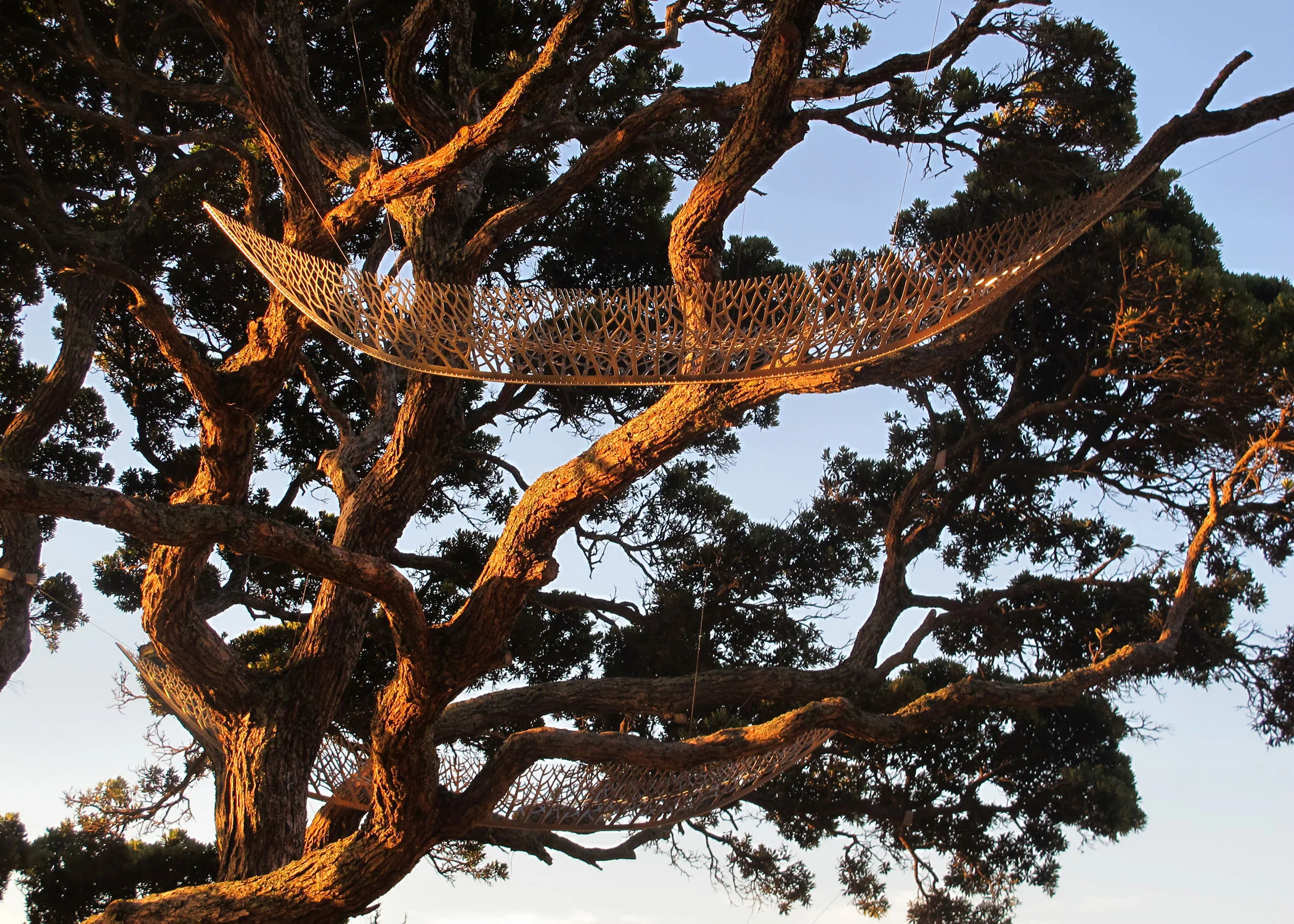 The installation of branching vessel forms evolved to become a fleet of delicate and filigreed Artworks suspended in a Pohutukawa tree above the sculpture trail. The Sculpture was conceived to create comparisons between the nautical, botanical and anatomical. While the forms suggest boat hulls, and empty seedpods, associated with water and land, the installation makes reference to environmental migration, endurance, and loss. The empty vessels appear stranded in space, and allude to immigrant’s deprivation and abandonment. The suspended vessels of Phantom Fleet imply rising seas, and the urgency of addressing global warming.