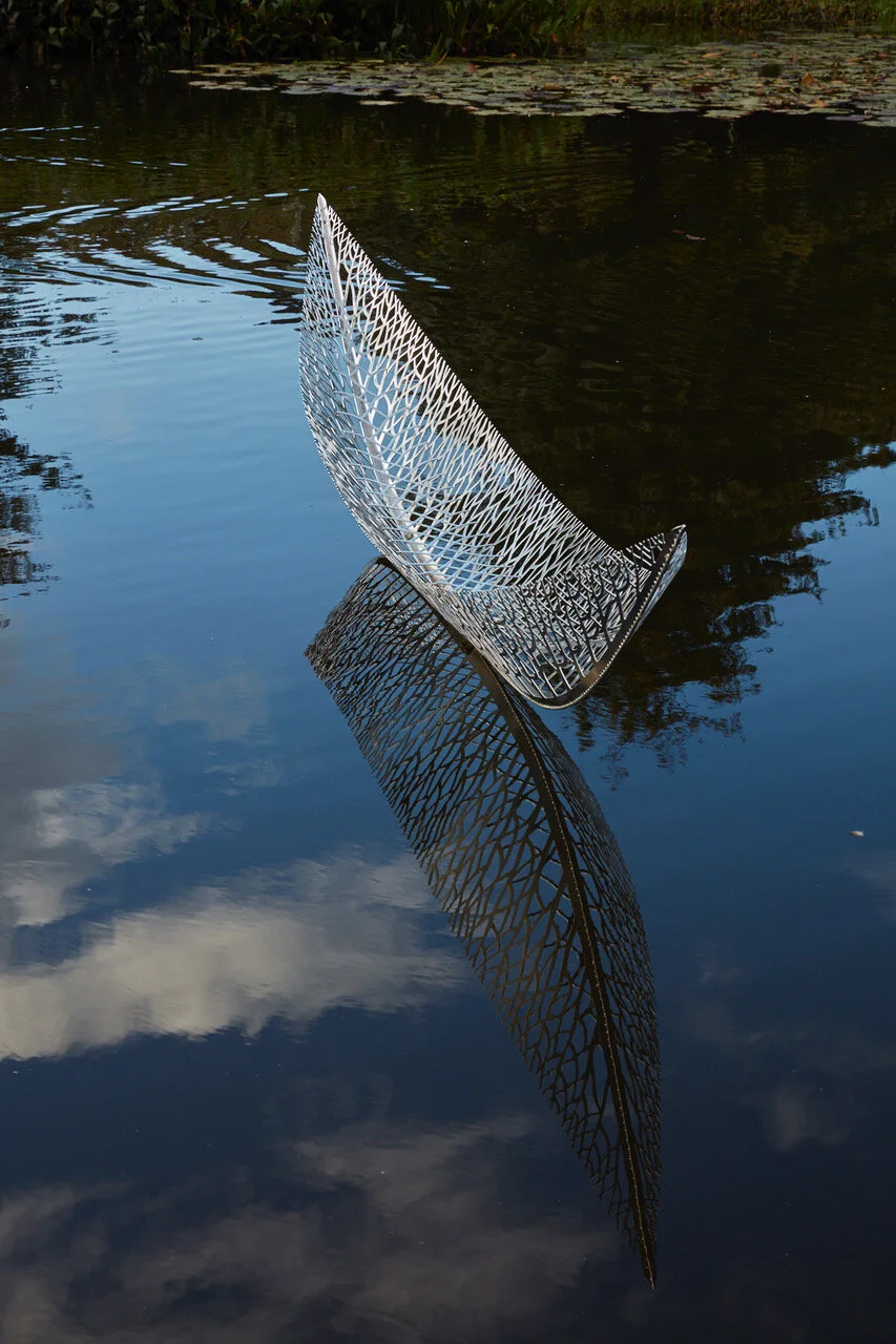 Each artwork has a fabricated stainless steel stand, for ground or in a pool display.